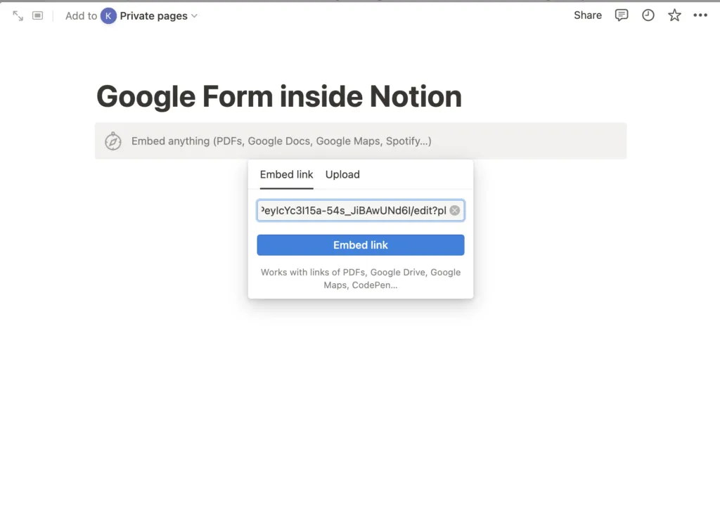 Embed Google Form in Notion