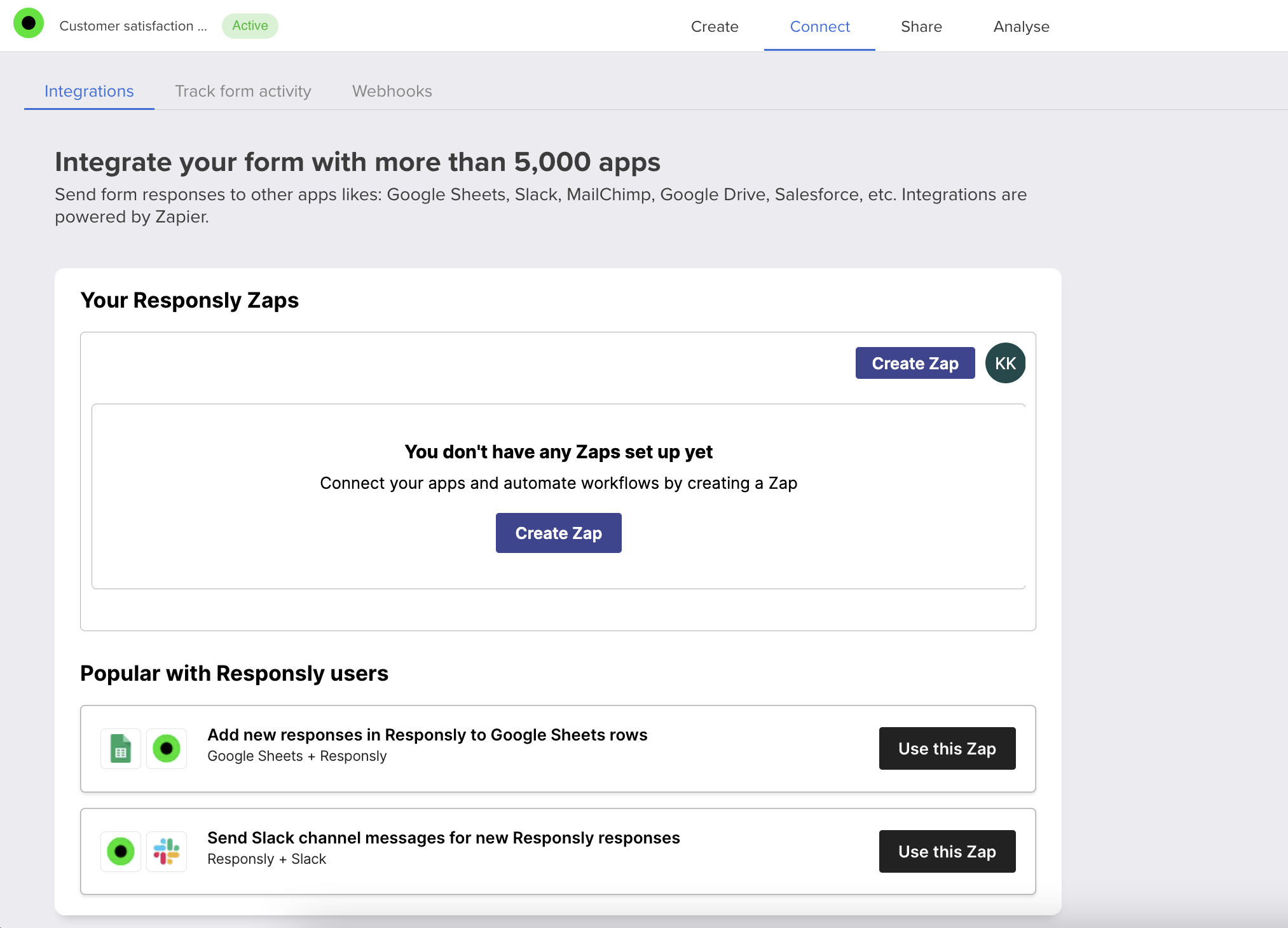 Using Responsly as a Zapier trigger, you can send collected survey responses to apps like Google Sheets, Slack, Microsoft Teams, Salesforce, Trello, Asana, and many more.